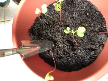 書上建議的種植方法是,一開始撒更多種子,在過程中再淘汰掉生長狀態不理想的植株(又稱為間苗),才比較能在最後種出健康的櫻桃蘿蔔。在這過程中,孩子也慢慢更完整地理解,植物種植更全面的面向,要考慮的東西還有很多很多。