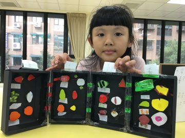從老師提議的各種題目中,孩子最終選擇以「每個季節有哪些水果?」作為題目,並且用兩種不同的藝術作品(剪紙、縫紉)作為呈現方式。老師鼓勵孩子以藝術作品的方式呈現,一來是因為這次專案課的其他部分,比較沒有涵蓋到藝術,專題剛好可以補足這個不足;二來是以孩子目前的書寫能力來說,如果要把整個研究以文字呈現,會是很大的負擔,也更難喜歡上研究的過程。