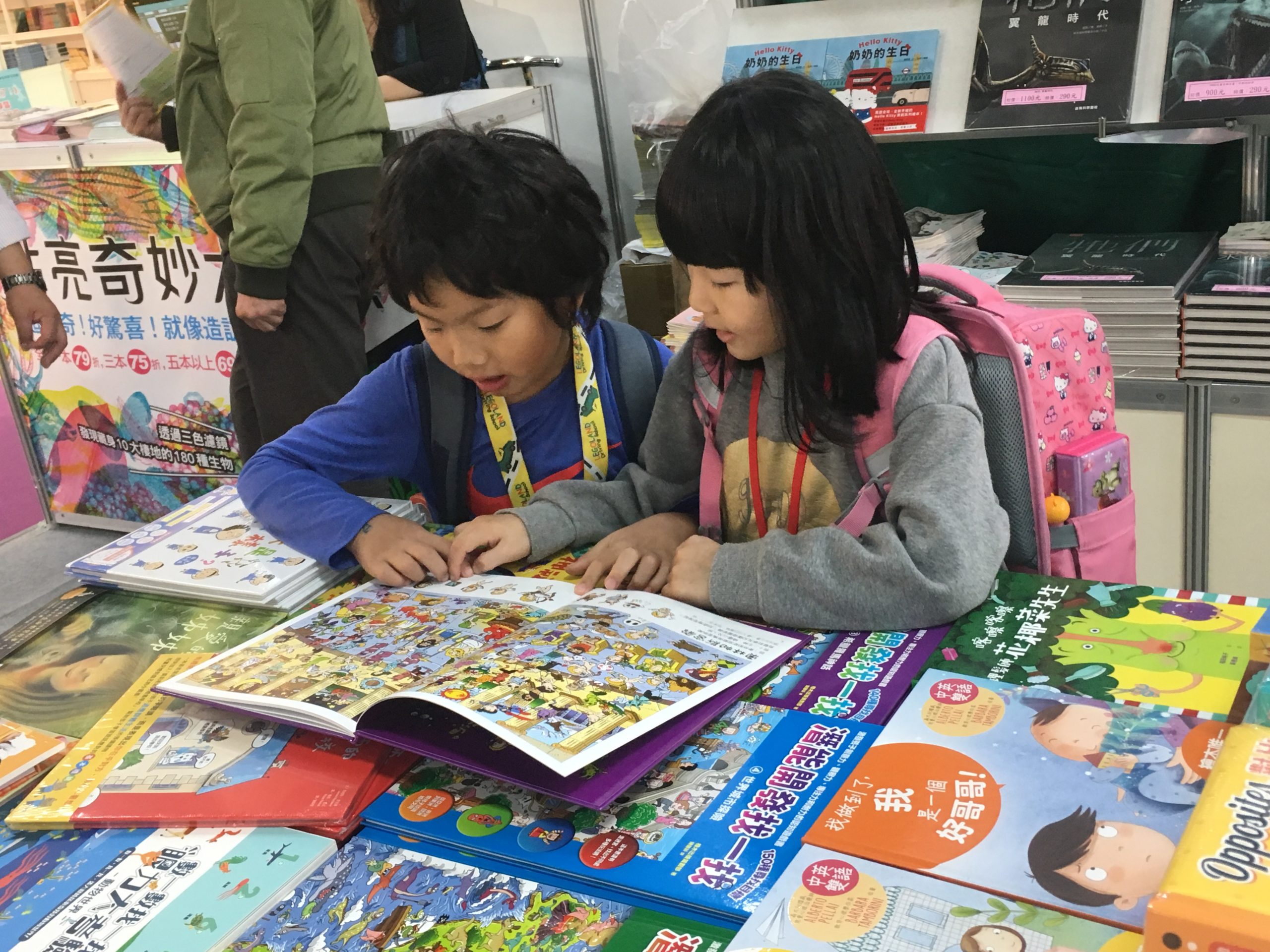 孩子一到熱鬧的書展,馬上被各種吸睛的攤位、書籍吸引住,而這時事先公布的任務就很重要,可以讓孩子聚焦回要觀察的目標。書展的過程中,孩子照著任務上要觀察的內容,走訪各種感興趣的攤位,這時老師主要就是確保安全、從旁陪伴的角色,其它就讓孩子自己發揮了。