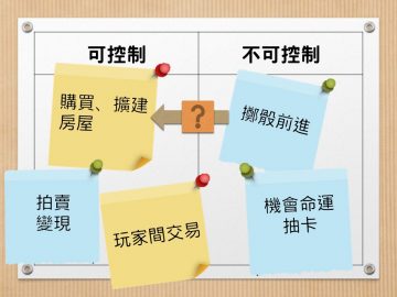 同樣是大富翁遊戲,透過規則的變化,就會讓遊戲的可控制/不可控制因素有所改變,也會影響遊戲玩起來的感覺。