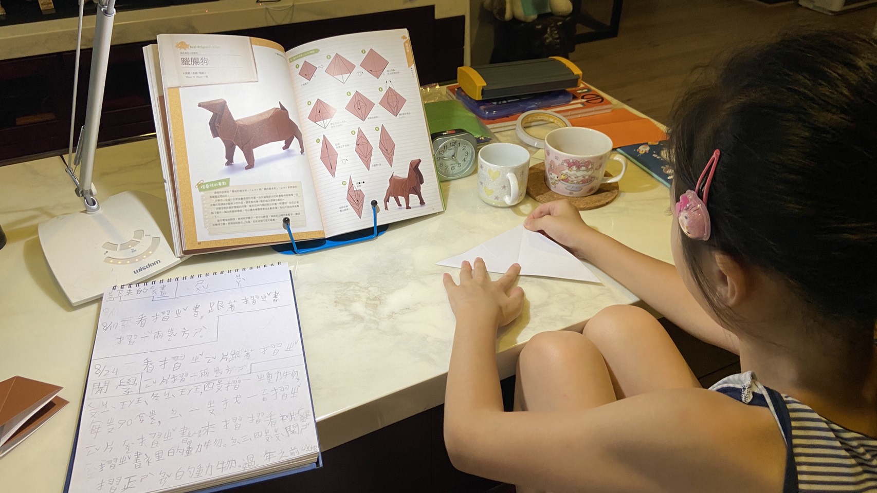 (媽媽拍下孩子在家進行摺紙研究的樣子。)